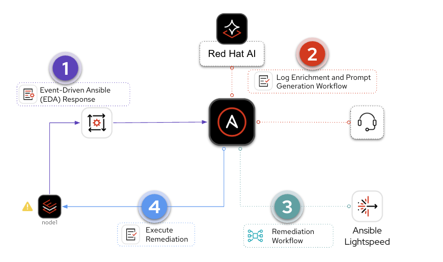 | Self-Healing | EDA detects event → AI diagnoses root cause → Ansible Lightspeed generates a new remediation playbook → policy engine validates → playbook executes | AI generates new automation on-the-fly within policy boundaries |